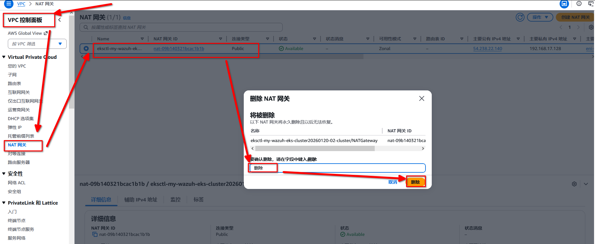 进入 VPC 控制台 -> NAT Gateways -> 选中你的网关 -> 操作 -> Delete