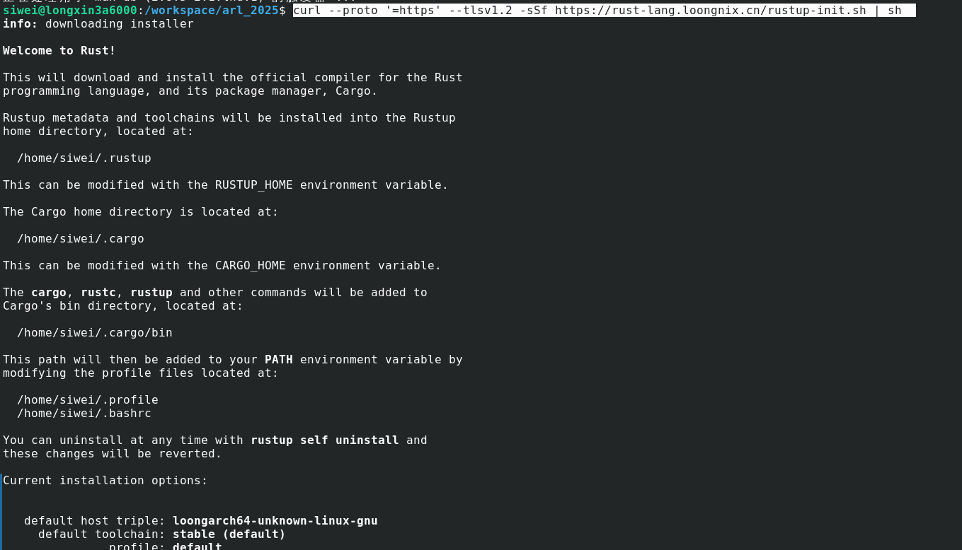 curl --proto '=https' --tlsv1.2 -sSf https://rust-lang.loongnix.cn/rustup-init.sh | sh