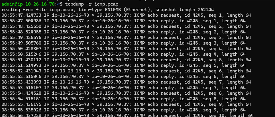 sudo nohup tcpdump -i ens5 icmp -w icmp.pcap > icmp.log 2>&1 &