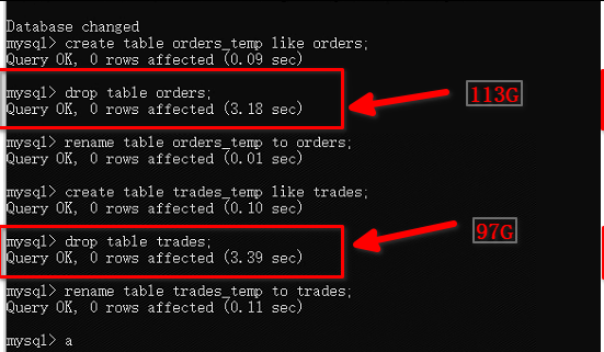 mysql> create table orders_temp like orders; Query OK, 0 rows affected (0.66 sec) mysql> insert into orders_temp select * from orders where member_id != 19 ; (只保留 id != 19的) Query OK, 531 rows affected (1.66 sec) Records: 531 Duplicates: 0 Warnings: 0 mysql> drop table orders; Query OK, 0 rows affected (0.63 sec) mysql> rename table orders_temp to orders; Query OK, 0 rows affected (0.12 sec)