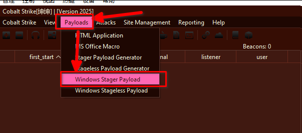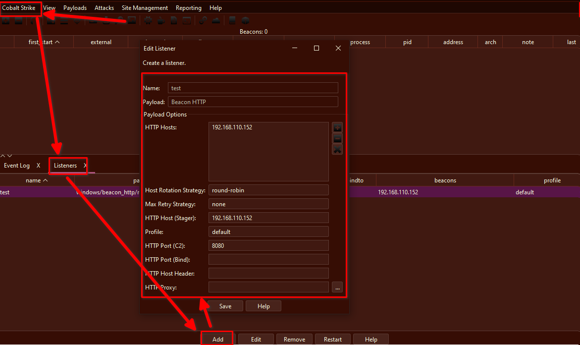 1. cobalt strike -> listeners -> add