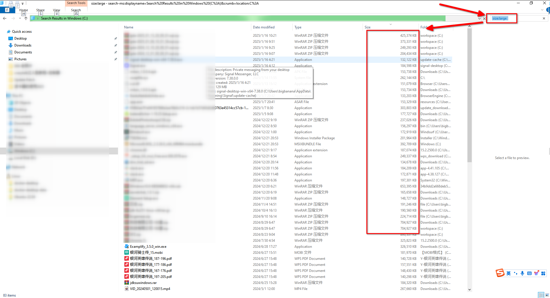 windows - 查找大文件 size:huge size:large 2025-01-17 08:27 访问量: 34 1. win + e 2. 右上角 search bar, 输入 size:huge 就可以看到了。直接删掉无用的。